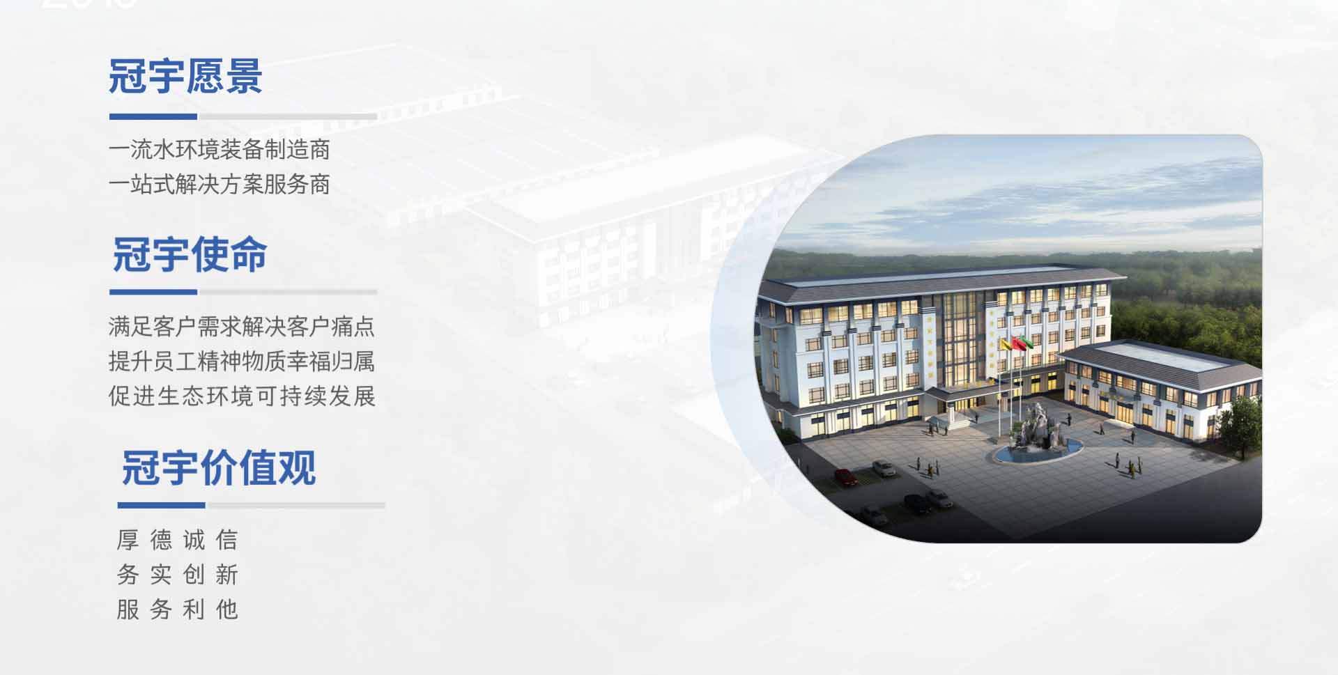 河北冠宇環保設備股份有限公司是一家專注于水處理技術與環保裝備研發的高科技企業,集生產制造、技術研發、工程設計施工、進出口貿易于一體的國家高新技術企業、科技型企業、科技小巨人企業、創新型企業、專精特新企業、規上企業、掛牌上市企業,股權代碼:660171。公司成立于2006年,總部位于河北省石家莊市,是石家莊市環境服務業商會會長單位和河北省環境保護產業協會副會長單位。公司以“創新驅動、綠色環保”為核心理念,致力于城市供水與醫藥化工行業的生產用水處理、市政、印染等行業的污廢水治理。公司憑借自主研發的高級氧化設備,致力于并打造一流水環境裝備制造商及一站式解決方案服務商。